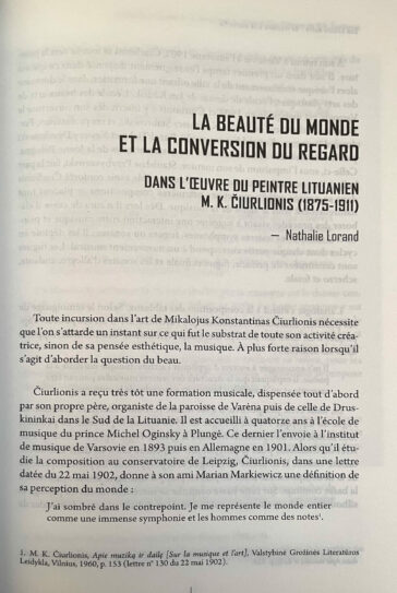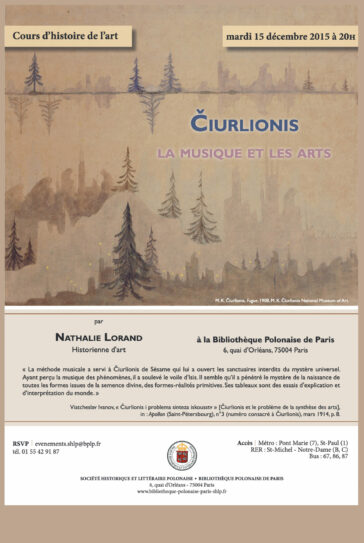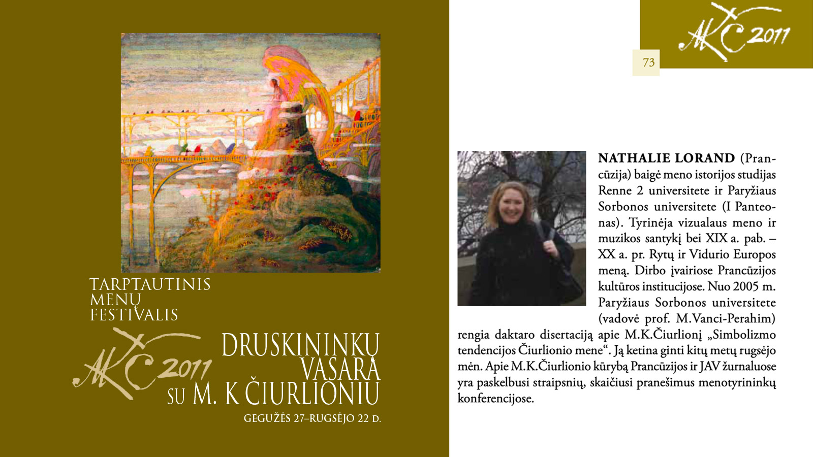 Nathalie Lorand a construit sa spécialisation Universitaire (université Rennes II puis Paris I Panthéon-Sorbonne) sur la relation entre musique et peinture dans les arts du XIXème et XXème siècle. Elle a rédigé une thèse sur l’artiste Lituanien M. K. Čiurlionis dont elle est spécialiste. À ce titre elle est régulièrement invitée à des colloques et conférences universitaires internationaux, notamment au colloque organisé à Vilnius et Kaunas (Lituanie) en 2011 pour le centenaire de l’artiste, au Musée d’Orsay, à l’Université de Bristol, etc…